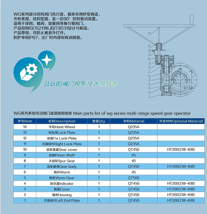 WG系列部分回轉(zhuǎn)閥門執(zhí)行器,殼體采用灰鐵或球鐵鑄造。外形美觀,結(jié)構(gòu)堅固。適用于球閥、蝶閥、旋塞閥等角行程閥門。具有90±5°調(diào)節(jié)功能,產(chǎn)品帶鎖,可防止閥門被意外開啟,整機可達IP65密封。